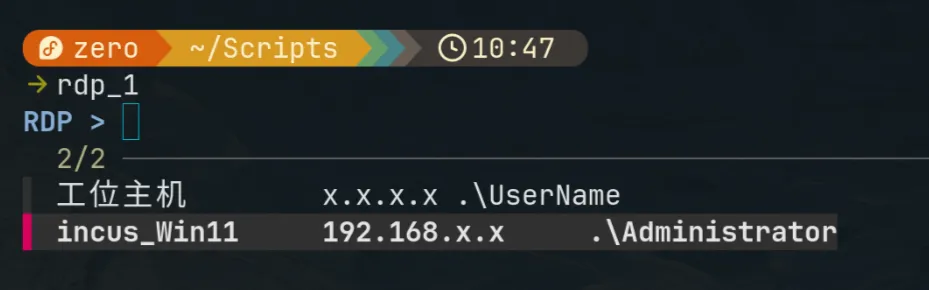 # 格式:显示名|HOST|USER# USER 直接写最终传给 xfreerdp /u: 的内容# 本地账号示例:.\admin# 微软账号示例:[email protected]ENTRIES=( "工位主机|x.x.x.x|.\admin" "incus_Win11|192.168.x.x|.\Administrator")