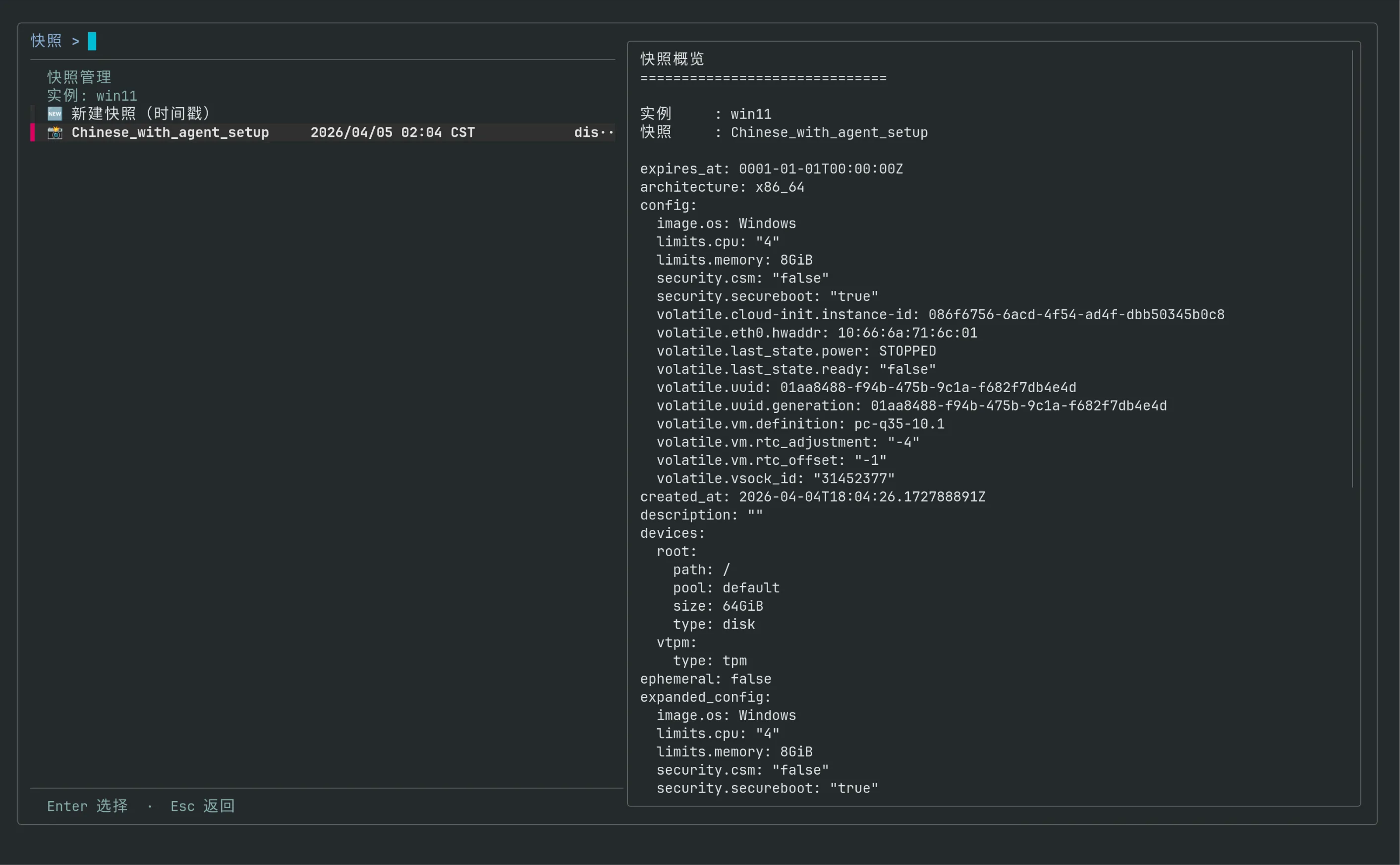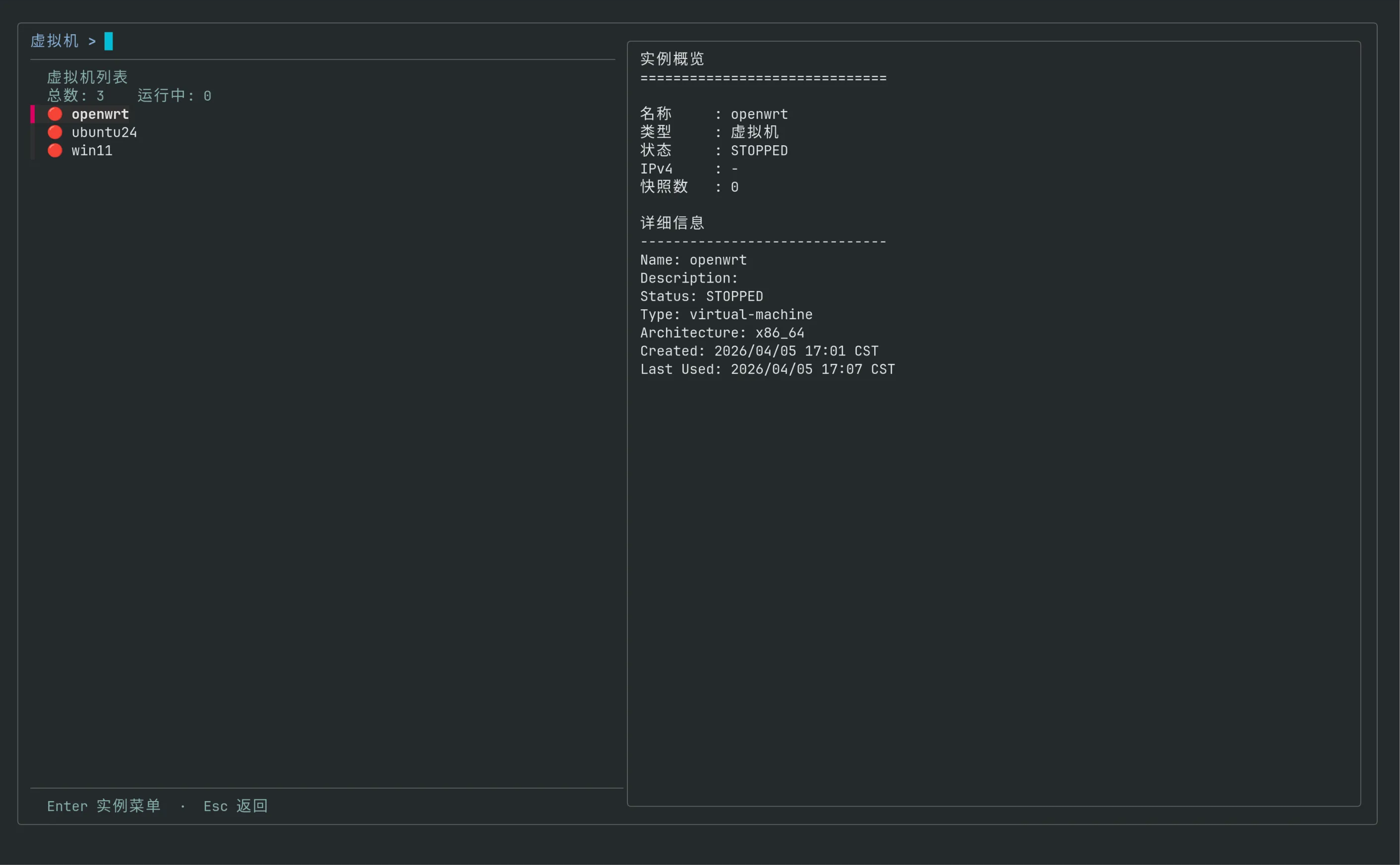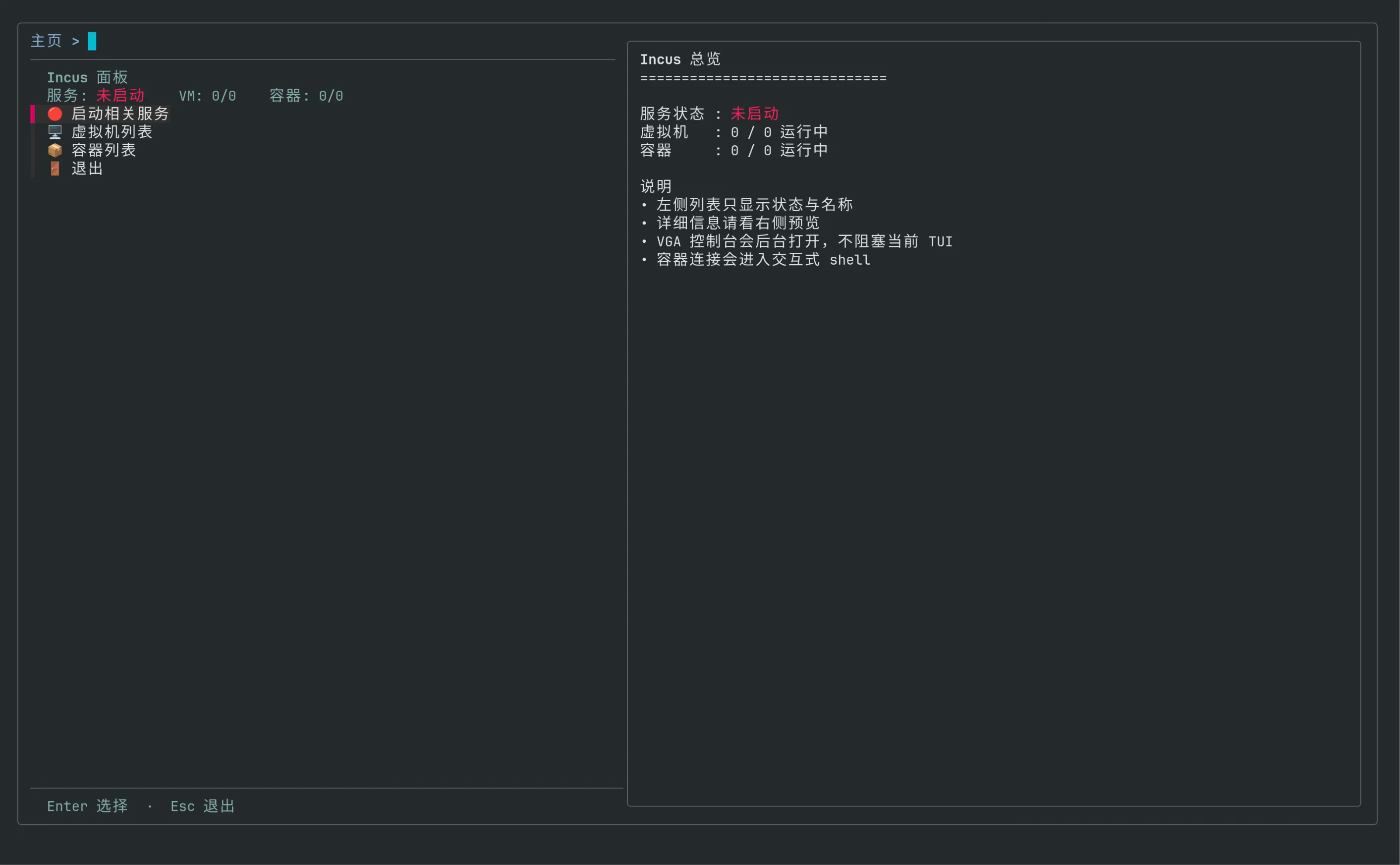 为了方便incus的使用,Vibe Coding了一个TUI管理脚本,实现的功能有incus后台服务的启停、VM/Container管理,主要涉及状态管理、信息查询、快照的简单管理等。