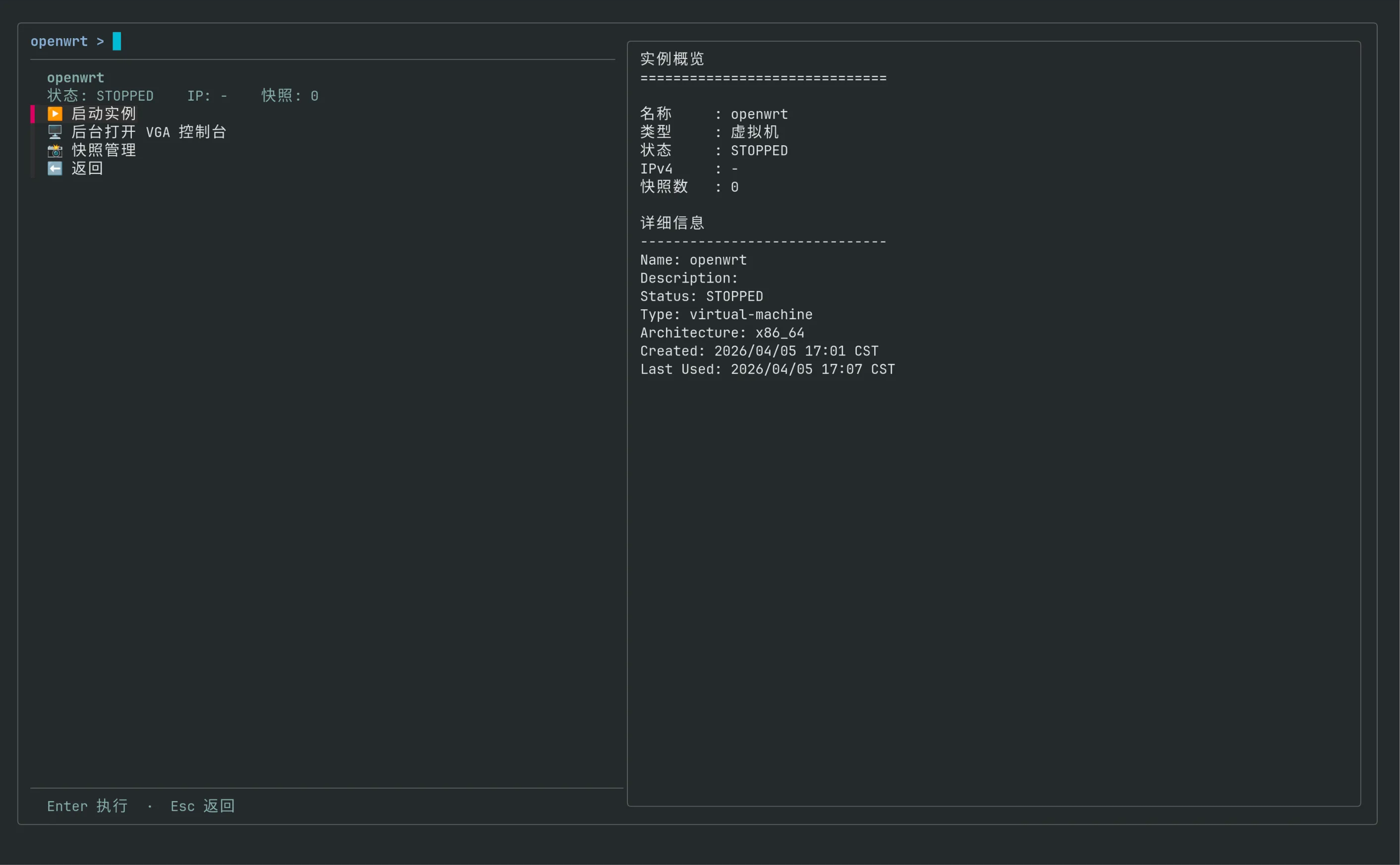 printf '\n%b说明%b\n' "$BOLD" "$RESET" printf '• 左侧列表只显示状态与名称\n' printf '• 详细信息请看右侧预览\n' printf '• VGA 控制台会后台打开,不阻塞当前 TUI\n' printf '• 容器连接会进入交互式 shell\n'}